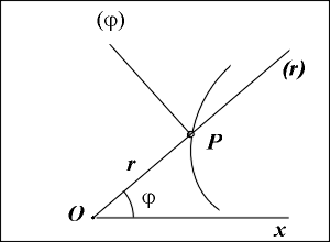В этом случае векторы v и a определяются по их проекциям на взаимно перпендикулярные подвижные оси Pr , имеющие начало в точке Р и движущиеся вместе с нею (см.рис.). Эти оси направлены следующим образом: ось Pr направлена по радиусу-вектору точки в направлении от полюса О к точки Р; ось P получается путем поворота вокруг точки Р оси Pr на прямой угол в положительном направлении отсчета угла , то есть против хода часовой стрелки.